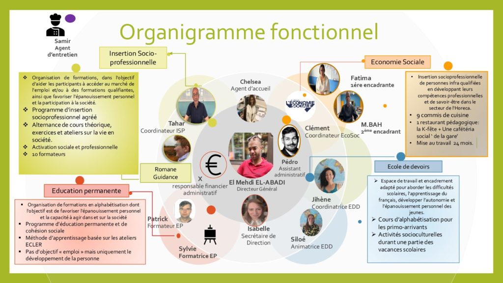• 8 jeunes sous statut ECOSOC (chômeurs de longue durée sans CESS) + personnel en Article 60 (nombre et profil variés suivant disponibilité avec les CPAS) ;